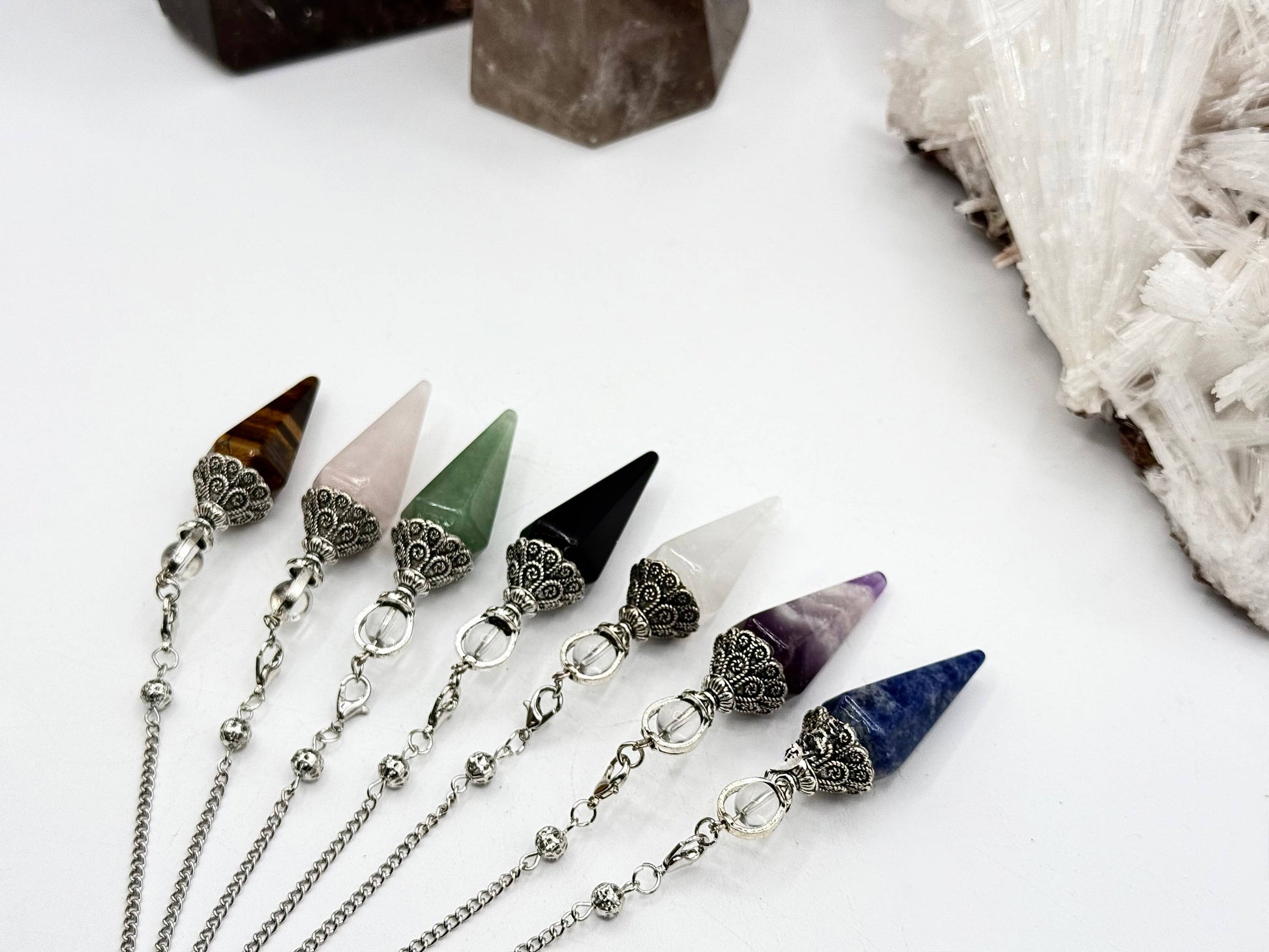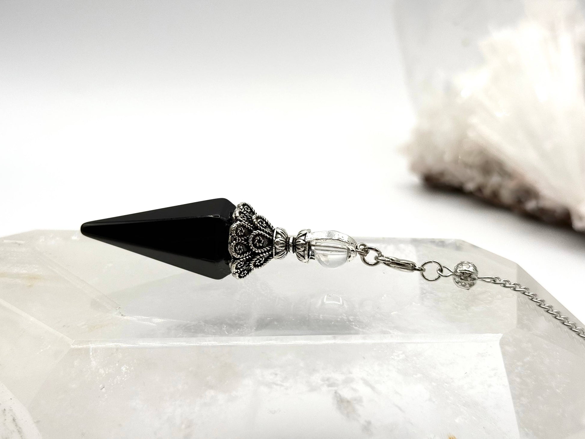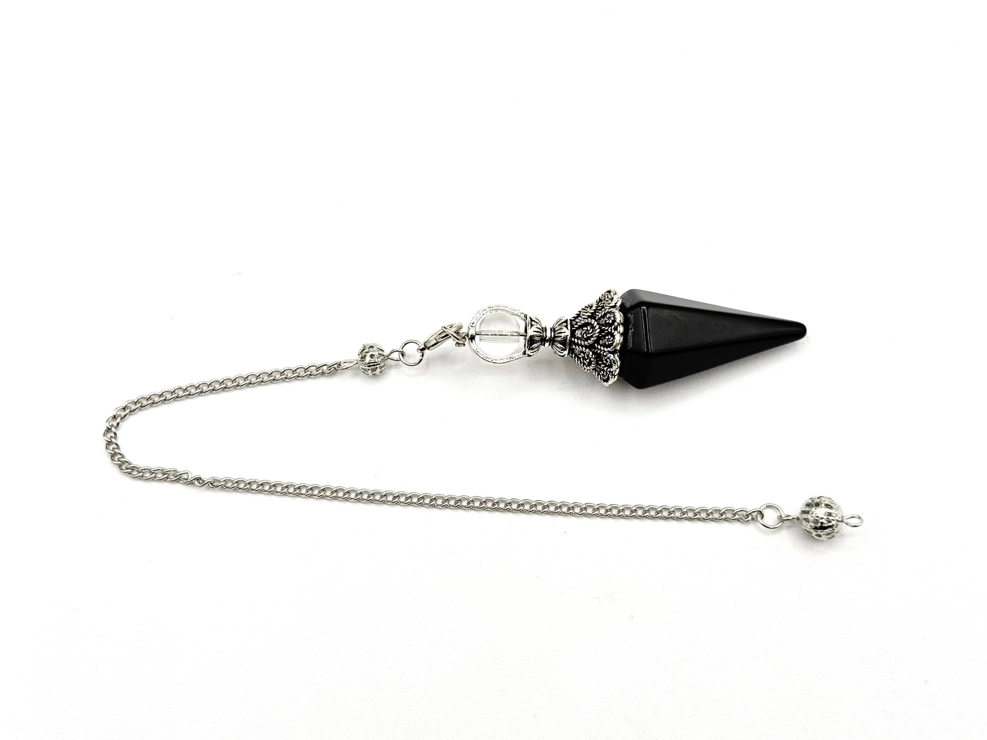This stunning Black Obsidian Double Cap Pendulum with Silver Plate Chain with lobster clasp chain Gemstone pendulums are amazing tools to channel energy into answers. They swing in one direction to answer “Yes” and another direction to answer “No” to questions you ask.